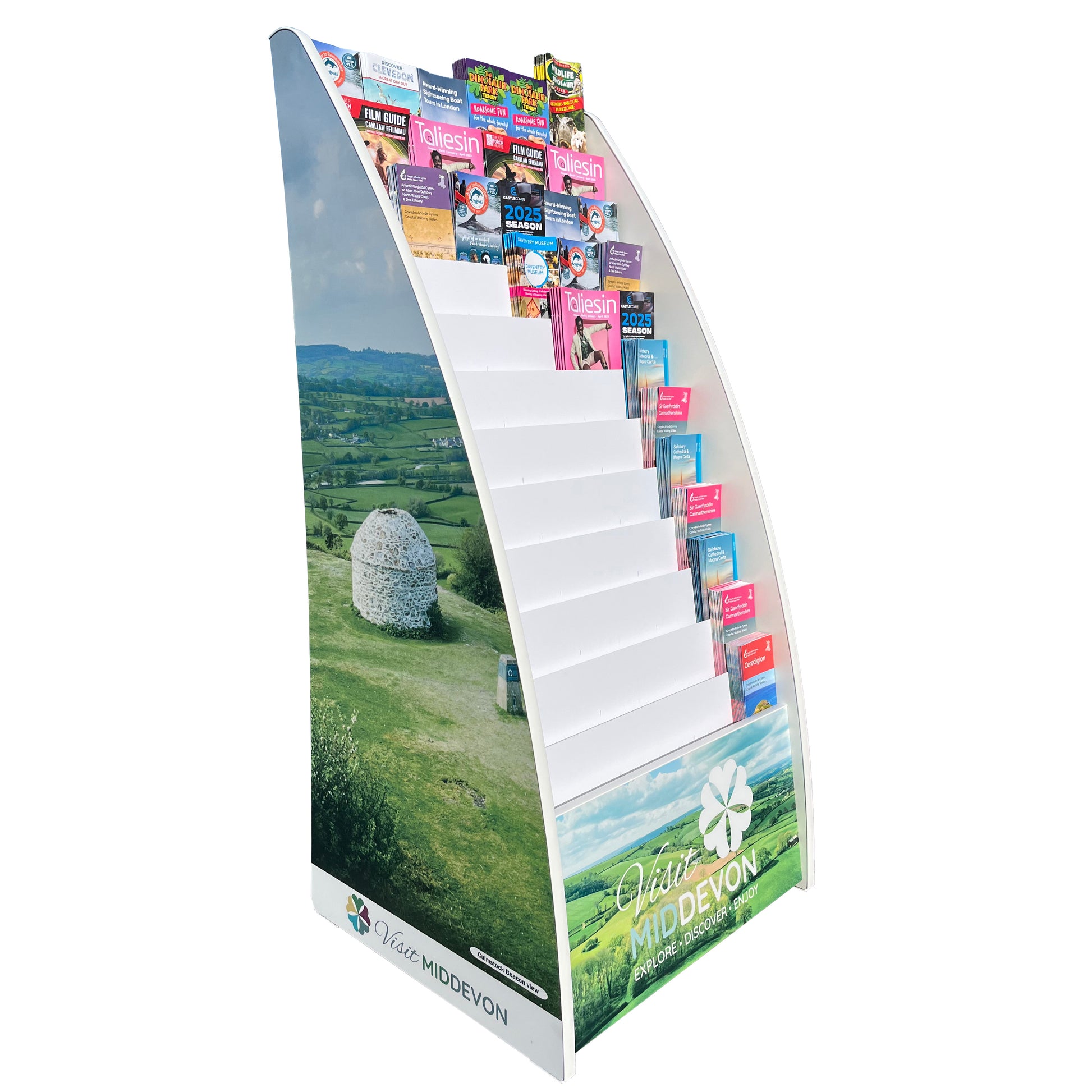 Q: What size leaflets and brochures does it hold? A: The 12 tiers comfortably hold A4, DL, A5, and folded brochures. Each shelf is designed to accommodate most standard leaflet formats used in commercial environments.