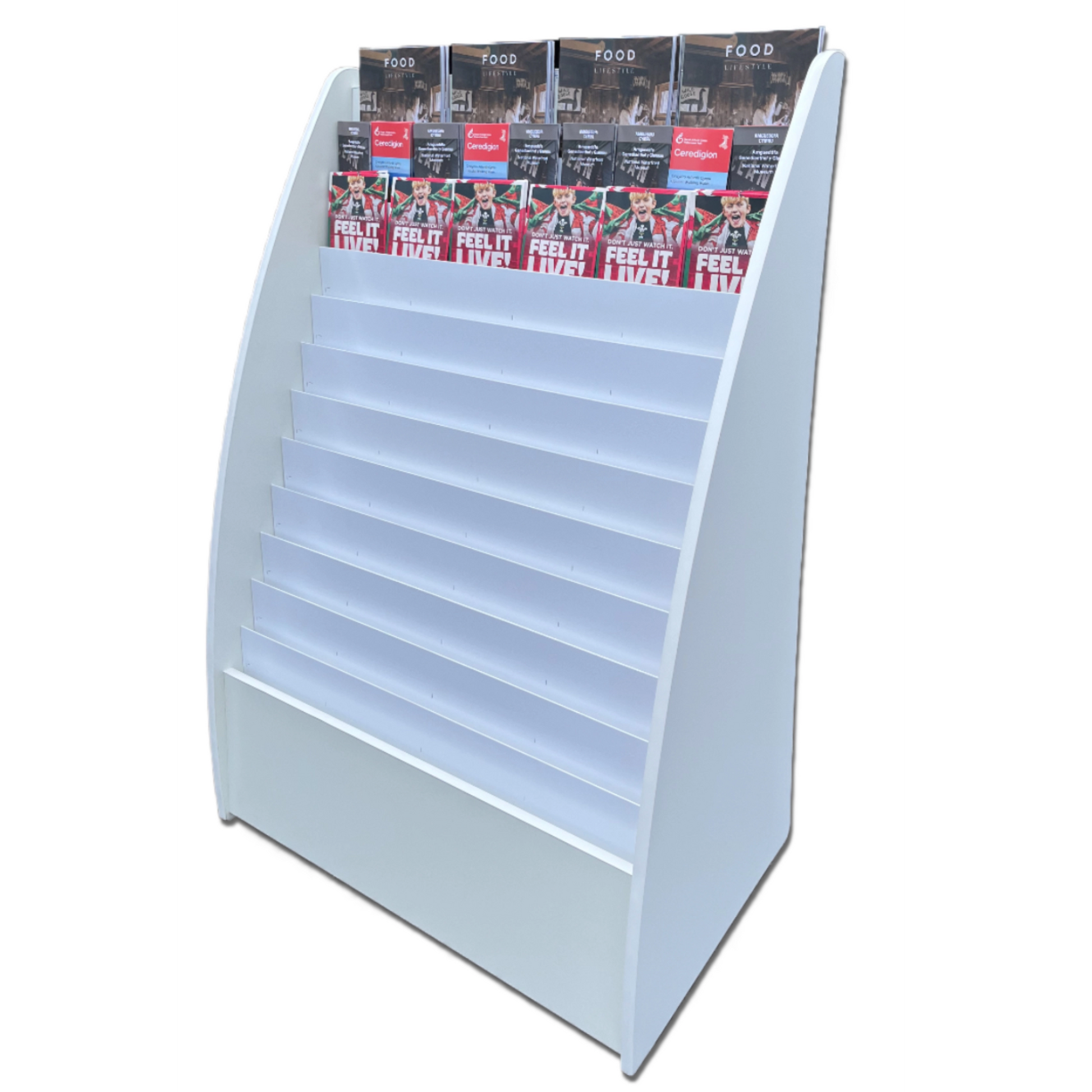 Keep your literature organised and accessible with this freestanding 12-tier leaflet display stand, handmade in the UK from Melamine Faced Chipboard (MFC) or Premium Birch Plywood. Designed for busy environments where presentation matters, it holds a large volume of A4 or DL brochures, leaflets, and flyers across 12 generous shelves — making information easy to browse for passing foot traffic. Ideal for tourist information centres, libraries, reception areas, waiting rooms, hotels, medical centres, estate agents, retail stores, exhibitions, and trade shows. Delivered fully assembled — no tools or setup required, just place and load. Available with optional custom printed or engraved branding to the sides and front, making it a professional, on-brand addition to any commercial space. Also available in premium birch plywood for a higher-end finish.